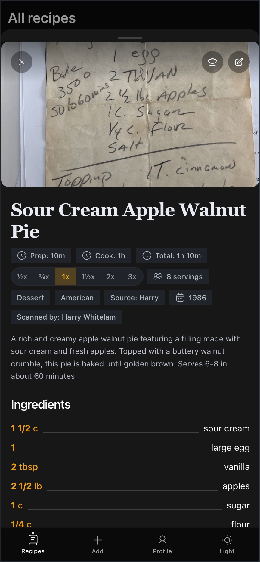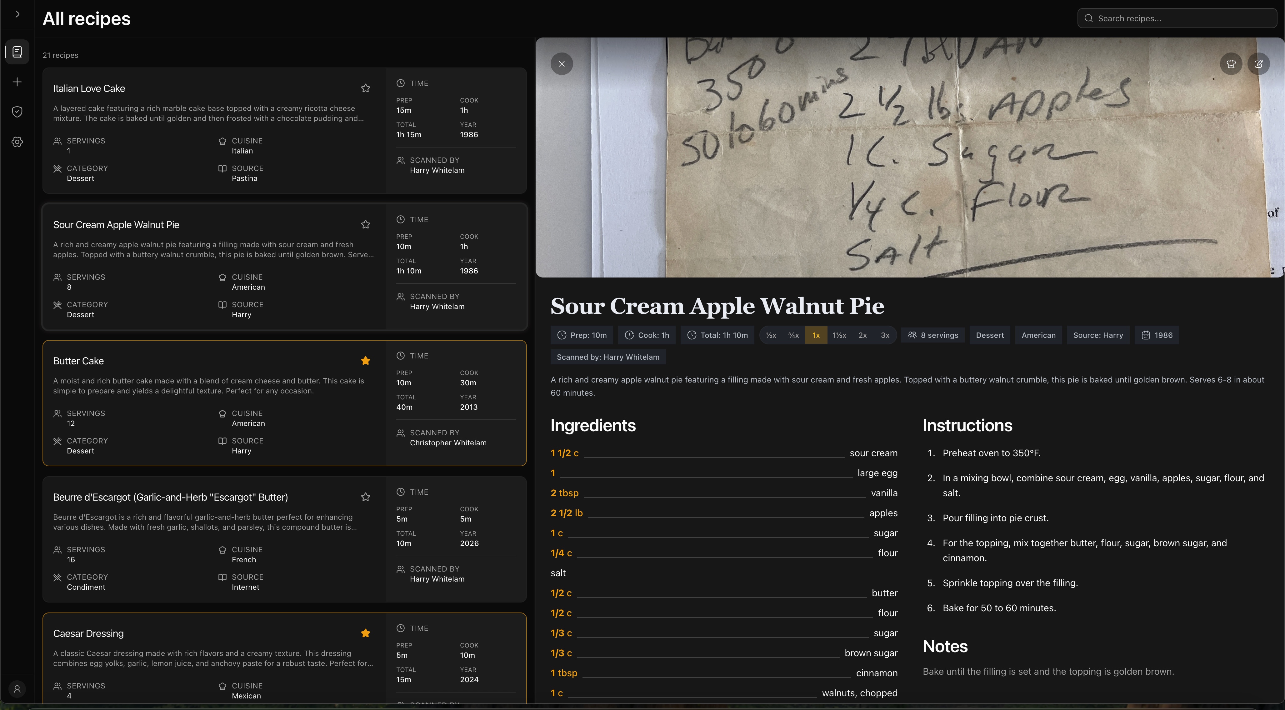 Built a private web app for scanning handwritten cards. AI parses the text into structured recipes while preserving the original images—the smudges, the corrections, the grease stains. Passwordless auth keeps it simple for non-technical family members.